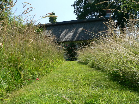 Das Grundstück selbst ist über 1.000 qm groß und ringsum mit Hecken sowie mit ein paar größeren Bäumen bewachsen. Vor dem Haus stehen Ihnen eine ebenerdige Steinterrasse und eine Liegewiese zur Verfügung, hinter dem Haus noch eine Klinkerterrasse. Hinter einer weiteren Heckenreihe schließt sich ein größerer Wiesenabschnitt an, in den ein kleiner Teich eingelassen ist. Vor allem diese Wiese ist eine Wiese; erwarten Sie keinen gepflegten englischen Rasen. Ich halte es eher mit absichtsvoller Verwilderung – Stichwort: naturnahes Restbiotop. Sie können sich selbstverständlich unbefangen bewegen. Nur bitte ich Sie, dem Tümpel nicht zu nahe zu treten. Der ist kein Badeteich, sondern für Frösche, Molche und anderes Getier gedacht.
