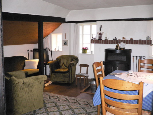 Das Wohnzimmer ist der mit Abstand größte Raum in der Kate und bezieht sein Tageslicht aus sechs Fenstern, die in drei verschiedene Himmelsrichtungen weisen. Hier befinden sich ein bequemes Sofa, zwei dazugehörige Sessel, ein Eßtisch mit vier Stühlen, ein Kleider- und ein Bücherschrank (mit Ostfrieslandliteratur und einigen Spielen), zwei offene Regale für Ihre Kleinigkeiten, ein Farbfernseher nebst DVD-Spieler, eine Stereoanlage mit CD-Spieler und ein sehr potenter Kaminofen.