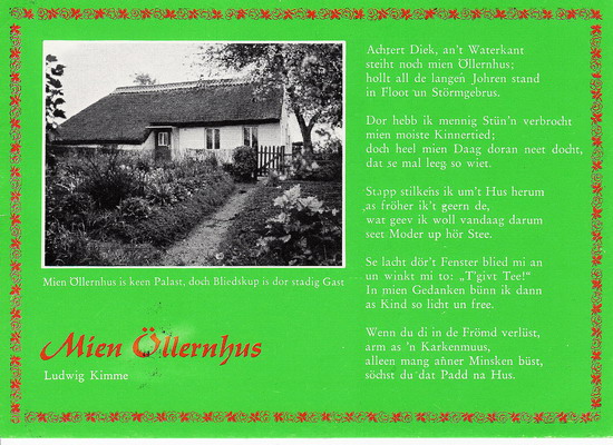 | Die Kate als Postkartenmotiv aus den 50er Jahren. Das Öllernhus ist natürlich das Elternhaus. | |||||||